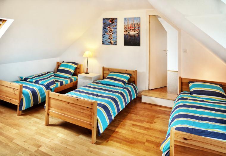 La 4ème et dernière chambre à l’étage, 22m2, couchage en 4 lits simples. Ici aussi: vue sur le large.
