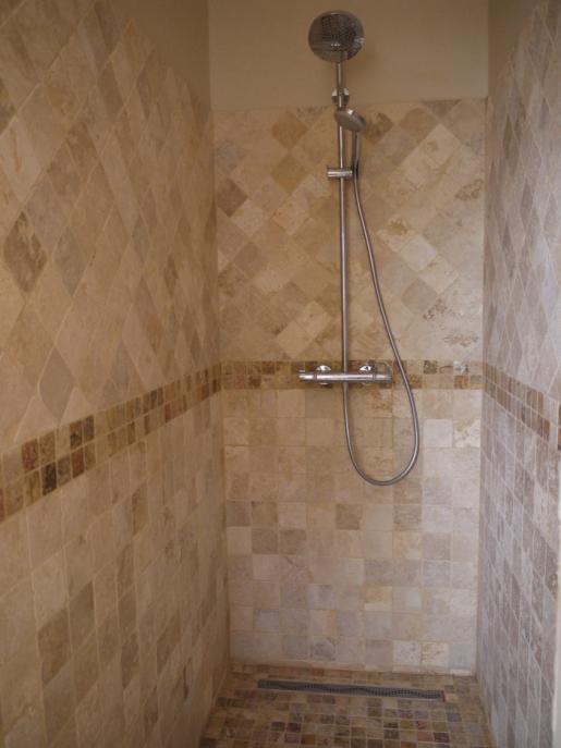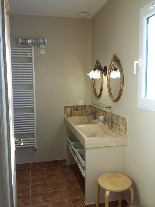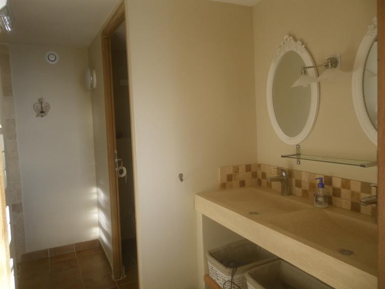 En Rez de Jardin : 2 chambres climatisées, chacune avec salle d’eau-douche italienne, vasques pierre et wc séparé,