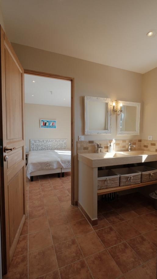 et une suite familiale composée de 2 chambres (sans dressing) dont une traversante et en commun une salle de bains- douche italienne, vasques en pierre et wc séparé.