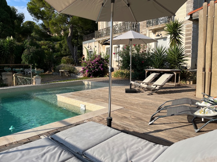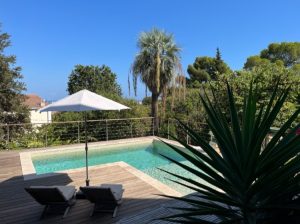 Une piscine chauffée de mai à septembre avec bains de soleil sur une grande terrasse en bois.