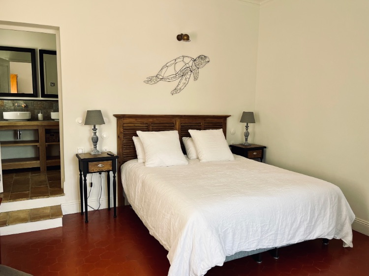 Il comprend 2 grandes chambres rénovées : chacune avec un lit de 180×200 (séparable) de qualité hôtelière haut de gamme, Télévision connectée, climatisation, volets roulants électriques. Salle de bain à l’italienne et WC japonais.