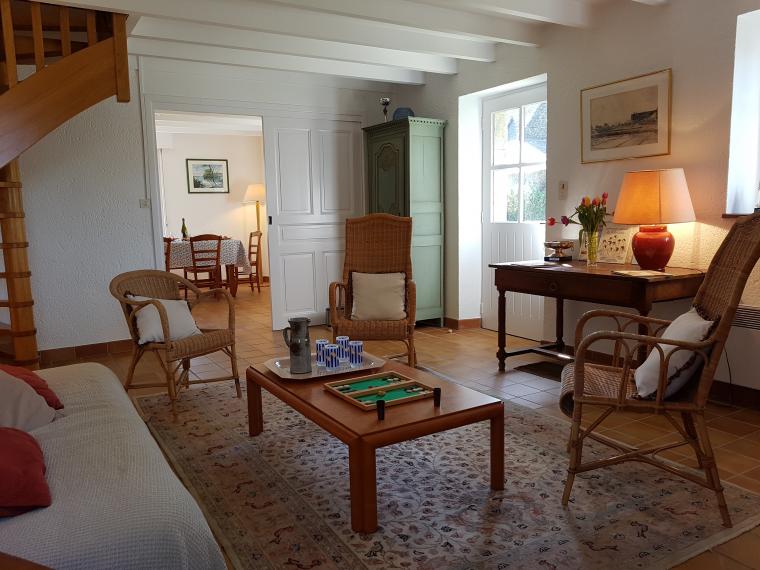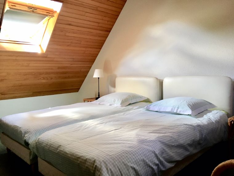 Rez de chaussée : salon, cuisine/salle à manger, une chambre avec un lit de deux personnes (largeur 1,50m), une chambre avec deux lits de 1 personne (largeur 90), une salle de bain et un WC séparé