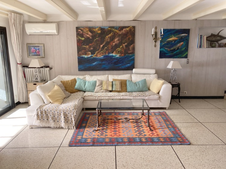 La villa de 100 m² est totalement climatisée, au rez-de-jardin, un salon avec deux sofas deux fauteuils, téléviseur.