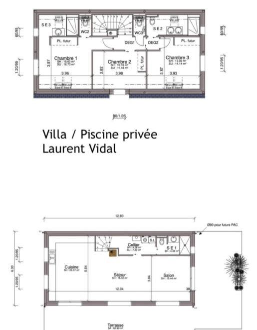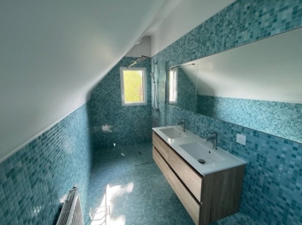 A l’étage: Trois chambres doubles, 2 salles d’eau avec sanitaires et douche à l’italienne, 1 cabinet de toilette avec sanitaires et lavabo.