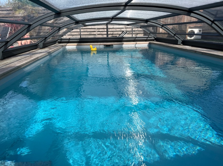 Recouverte d’un abris coulissant complètement escamotable, Il est possible de se baigner avec l’abri fermé à la mi-saison