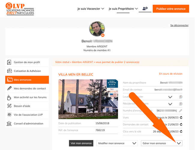 👉 Une fois identifié, rendez-vous dans l’onglet “Mes annonces” qui vous permettra d’accéder à la gestion de votre planning depuis le menu “Gérer mon annonce :