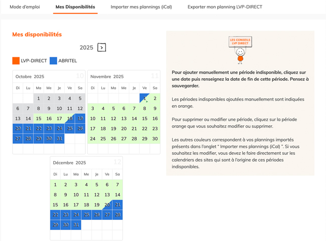 Dans l’onglet « Mes disponibilités », vous pourrez déclarer manuellement toutes vos périodes indisponibles ou déjà réservées.