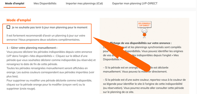 Pour ceux qui ne souhaitent pas utiliser la synchronisation de leur planning, il est possible de le tenir à jour directement depuis votre annonce LVP-DIRECT.