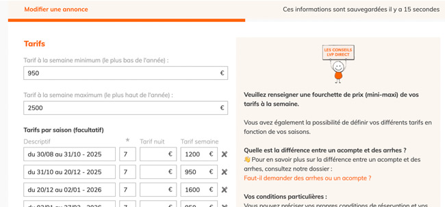 je suis abonné depuis 2020 chez vous en tant que propriétaire; je souhaite m’investir beaucoup plus sur le site et je suis en train de faire de la publicité sur votre site auprès d’amis nouveaux propriétaires de biens à meetre en location. Nous sommes tous conscients de vouloir privilégier la relation directe propriétaire/locataire . je rencontre un problème : comment mettre à jour le tarif à la semaine et le planning de réservation.